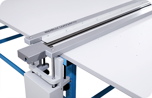 We used a double pneumatic pressure bar system with higher actuators, which enables cutting up to 20 layers of quilted material simultaneously.