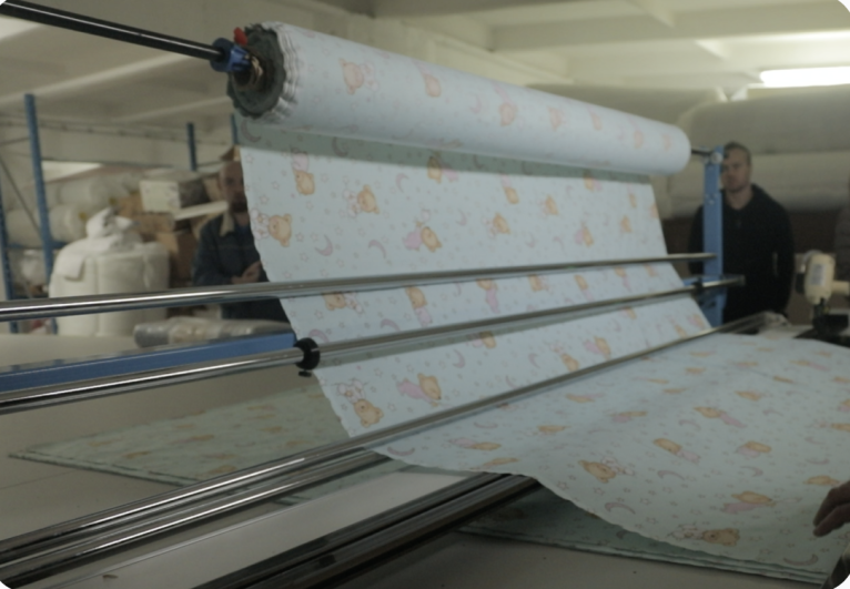 This table set has been custom-built for the manufacturer of quilts, pillows and mattresses.